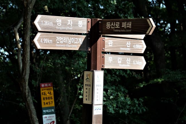 철탑을 지나 박석고개에 이정표가 세워져 있는데 등산로 폐쇄라는 안내판이 하나 붙어 있고,