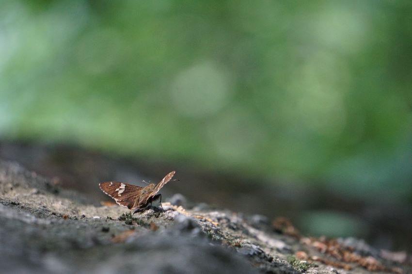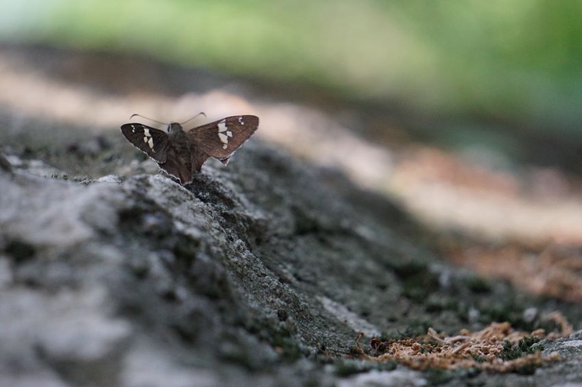 그러다 만나는 바위동산에 배낭 내려놓고 쉬어갑니다. 13-2 버스 종점(우산1리)에서 내려 걷기 출발, 이 지점까지 3.8km 진행해 온 지점입니다. 그런데 이 바위는 주인이 따로 있었네요, 예쁜 나비 한 마리가 놀고 있었습니다. 배낭에도 살짝 내려앉고 어깨에도 슬쩍 내려앉아 주네요. 오늘 출발이 늦어 서둘러야 되는데 계속 같이 놀자고 하는 듯 주변에서 팔랑거리고 있습니다.