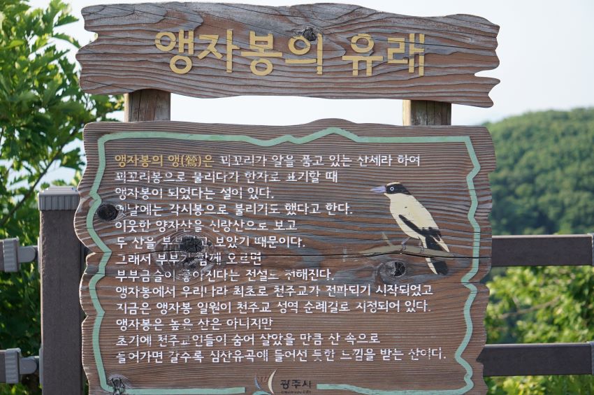 앵자봉(667m)은 높은 산은 아니지만 초기에 천주교인들이 숨어들어 살았을 만큼 심산유곡, 깊은 산골입니다. 그리하여 우리나라 최초로 이곳에서 천주교가 전파되기 시작하였고 이곳이 천주교 성지로 되어 천주교 성역순례길로 지정되어 있습니다.