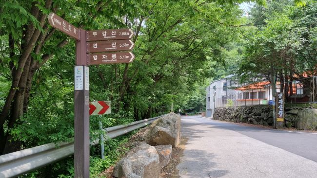 천진암성지 주차장 입구에 산행 안내판 지나 조금 올라가면 이정표가 기다리고 있습니다. 앵자봉은 우측, 청소년야영장 방향으로 정상까지 5.1km, 내비에는 주차장 왼쪽으로 올라가는 경로도 뜨는데 들머리를 찾을 수 없네요. 이따 하산할 때 왼쪽으로 내려오는 코스, 내비 따라 내려올 생각으로 정리하고 청소년 야영장 가는 방향으로 시작부터 만만찮은 오르막 아스팔트 포장도로를 따라 올라갑니다.