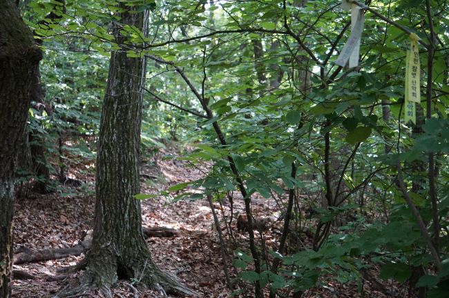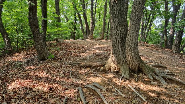 글참나무 오르막길은 계속됩니다. 숨 차오르죠, 이곳은 첫 번째 만나는 작은 봉우리, 쉼터가 있으면 딱 어울릴 자리인데 없습니다. 계속 만만찮은 오르막 산길을 올라가면 또다시 작은 봉우리, 숭실대 학교림을 표시하는 노란 말뚝이 세워져 있고, 쉼터로 딱 어울리는 자리인데 벤치 없습니다. 쉬어가고 싶은데 쉴 마땅한 자리가 없어 계속 숨 고르며 올라갑니다.